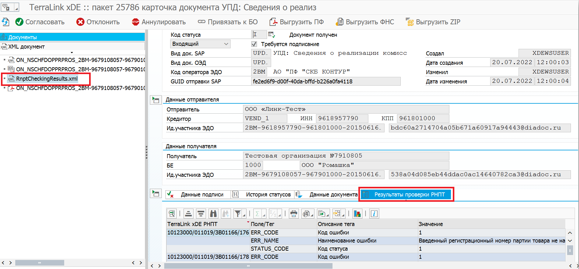 После ответа от системы будет сформирован статус документа RN, содержащий ссылку на файл с результатами проверки РНПТ.