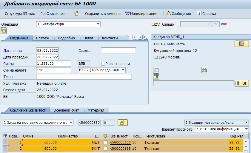 Код материала, переданный контрагентом в дополнительных данных к документу, должен совпадать с кодом материала в учетной системе SAP (см. раздел Сопоставление позиций электронного документа и документа SAP).