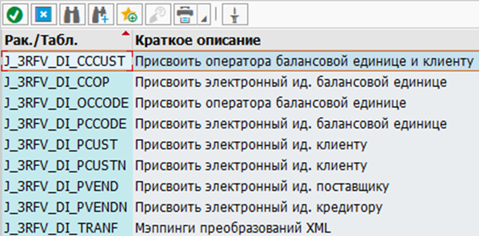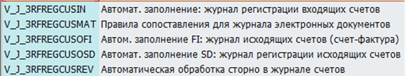 Все настройки, представленные ниже, можно найти в тр. SM30, а также через тр. SPRO (Финансы => Бухгалтерия дебиторов и кредиторов => Бизнес-операции => Параметры настройки для страны => Россия => Счета-фактуры => Журнал счетов => Электронное выставление счёта).