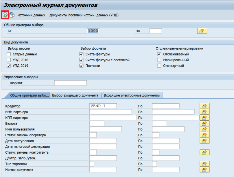 J3RFUTDIN(илиJ3RFUTD), на селекционном экране ввести необходимые параметры поиска документов, нажать «Выполнить».