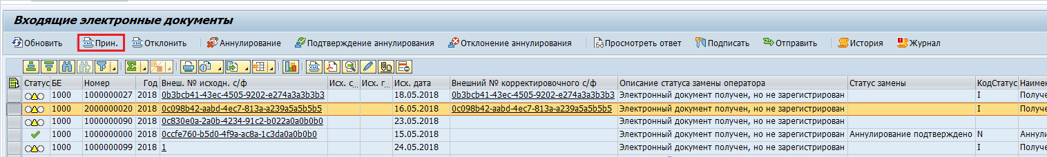 В зависимости от типа, входящий документ может быть аннулирован отправителем в одностороннем порядке или через запрос аннулирования. Обработка запроса на аннулирование аналогична описанной в разделе об отправке исходящих документов через журнал SAP (необходимо проделать шаги 1-2 из раздела Обработка входящего запроса на аннулирование).