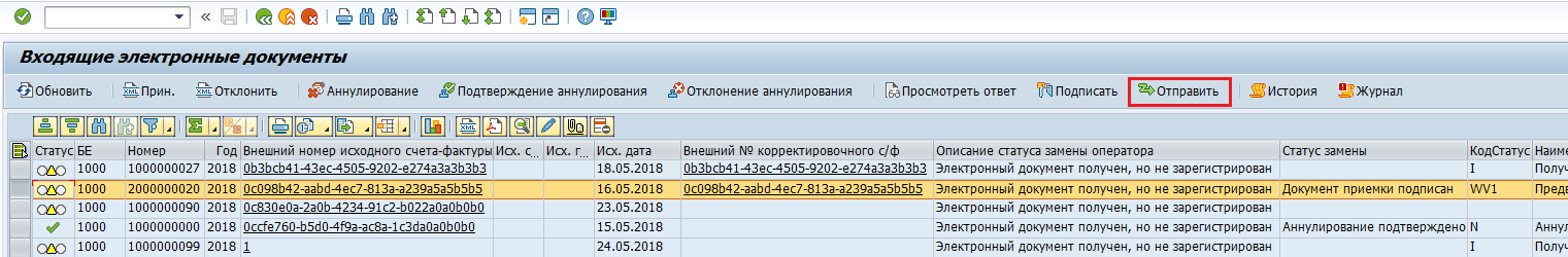 Отправка запроса на аннулирование документа аналогична описанной в разделе об отправке исходящих документов через журнал SAP (необходимо проделать шаги 1-4 из раздела Отправка запроса на аннулирование).