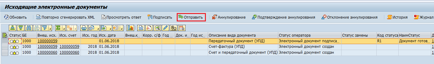 Для отправки документа из журнала электронных документов SAP необходимо выполнить следующие действия.