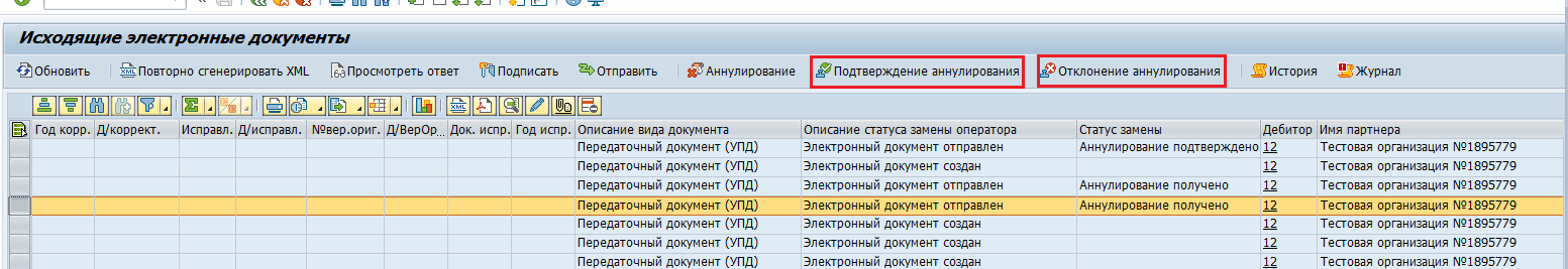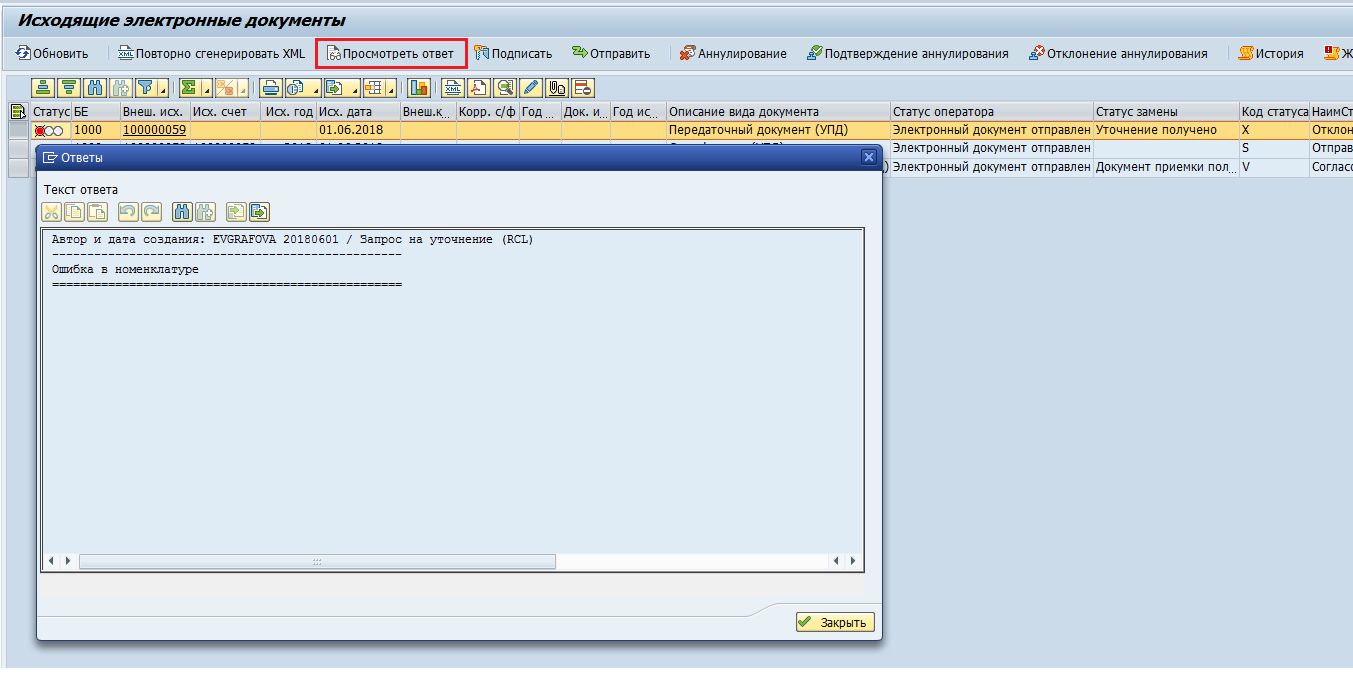 Согласно логике SAP, подписанный получателем УПД ДОП аннулируется сразу. Однако согласно логике операторов, данный документ аннулируется через запрос. Таким образом, необходимо дождаться обработки запроса контрагентом.