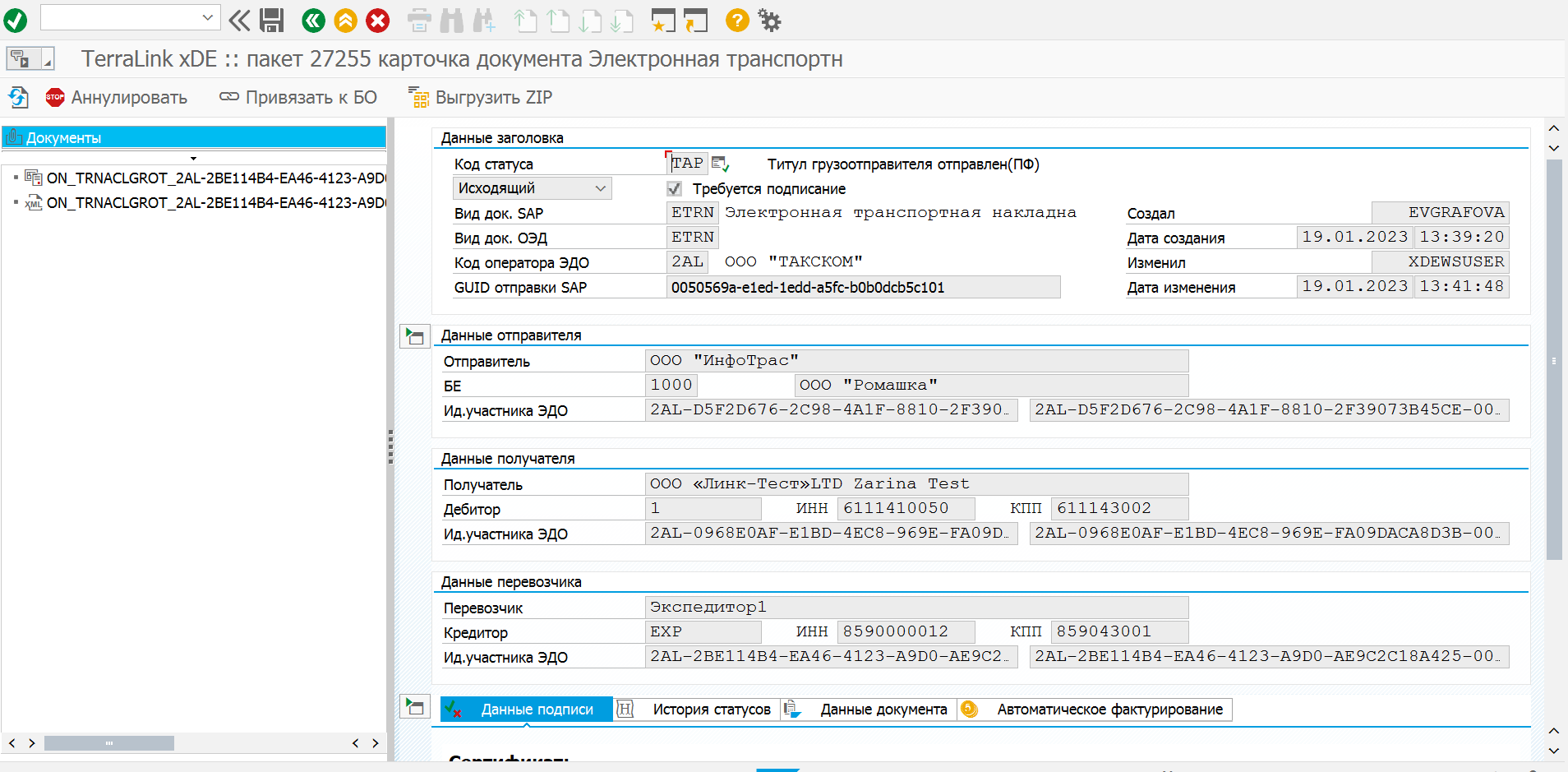 В разделе «Данные подписи» карточки ЭТрН также отражена информация о подписях всех участников процесса обмена документами данного типа.