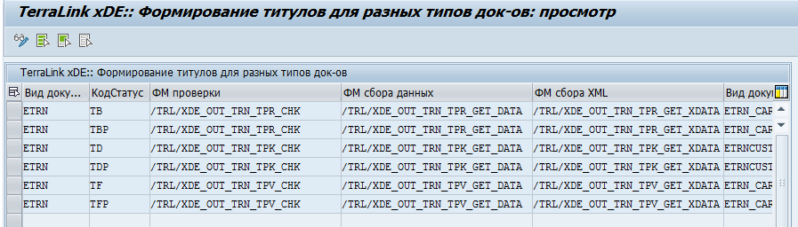 Для ведения через транзакцию SM30 введите имя ракурса /TRL/XDE_DOC_TTL. На данный момент эта таблица используется только для ЭТрН.