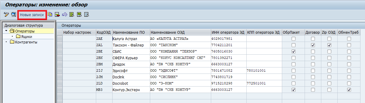 Операторы: изменение: обзорнажмите кнопкуНовые записидля внесения данных о новом операторе ЭДО.