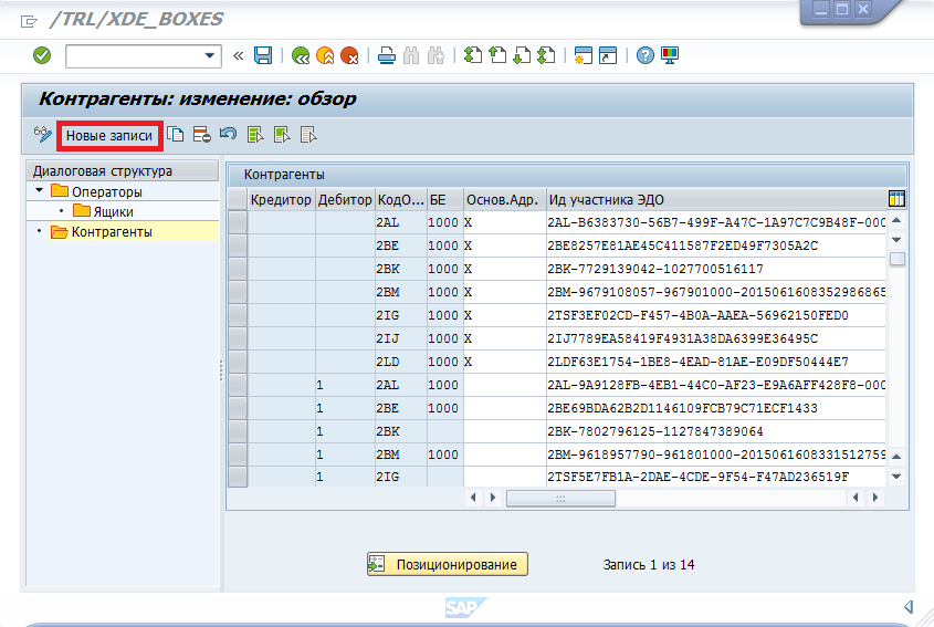 /TRL/XDE_CUSTдля настройки с именем «BOXES_CHECK_BUKRS» установлено значение «X», то при создании новой записи или изменении уже существующей записи с заполненным значением БЕ будет выполнена проверка идентификаторов ящика и ФНС по ИНН и КПП указанной БЕ (данные по ИНН/КПП берутся из таблицыT001Z). Если один из идентификаторов не совпадает с тем, который по данной паре ИНН и КПП заведен в интеграционнном модуле, будет выведено сообщение-предупреждение «Проверьте правильность заполнения данных для БЕ».Для присвоения нового ящика оператора ЭДО внешнему контрагенту заполняются поля: