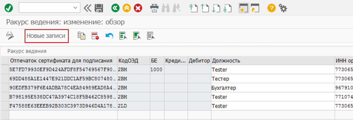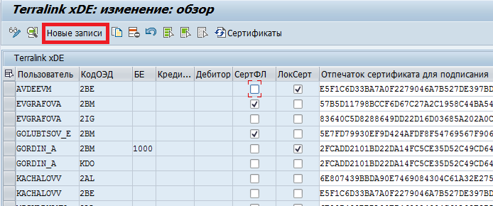 Ведение сертификатов пользователей в системе SAP осуществляется в настроечной таблице /TRL/XDE_V_CERT.