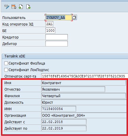 Модуль xDE для SAP ERP запрашивает информацию о сертификате (имя, фамилия и т.д.) из ИМ. При этом данная информация используется в модуле xDE для SAP ERP при формировании формализованных документов. Поэтому для корректной работы необходимо, чтобы данная информация была получена из ИМ для всех настроенных сертификатов.