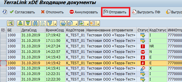 От контрагента пришел запрос на аннулирование документа. Запрос на аннулирование можно принять/согласовать («N») или отклонить («NR») |