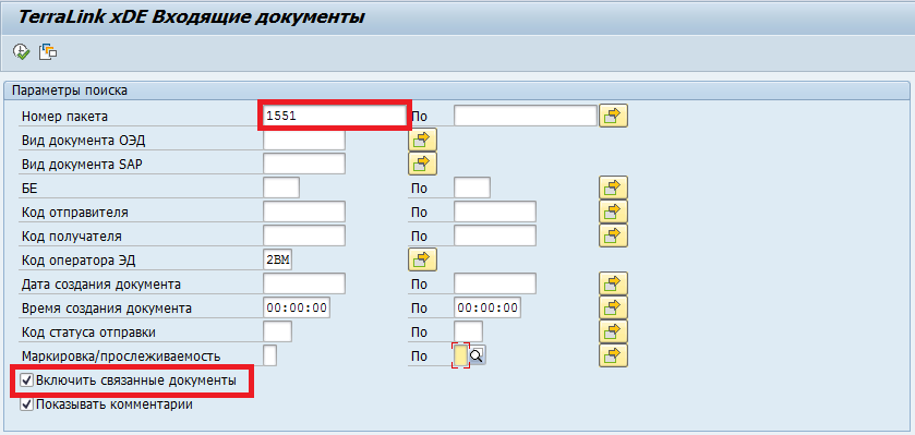 значение номера пакета документа и отметить пункт «Включить связанные пакеты», то на основном экране