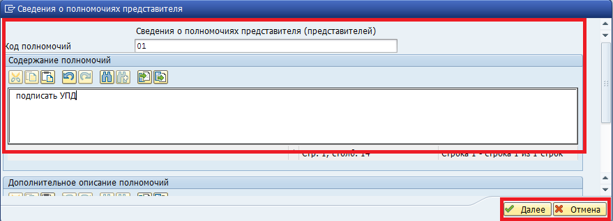 Для заполнения данных о полномочиях уполномоченных представителей введите данные на экране и нажмите на кнопку «Далее». В этом случае на ALV добавится новая строка. Если вы передумали, нажмите на кнопку «Отмена».
