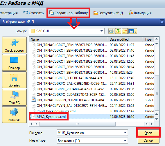 Во втором случае не нужно выбирать на ALV строку с МЧД. При нажатии на кнопку «Создать по шаблону» откроется окно для выбора XML-файла МЧД, который будет использоваться в качестве шаблона.