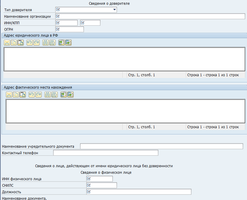 Все предзаполненные данные можно изменить, пустые поля можно заполнить. Это касается в том числе и данных об уполномоченных представителях и их полномочиях. Данные по уполномоченным представителям и их полномочиям можно изменять прямо в ALV, либо воспользоваться вызовом более удобного экрана для редактирования. Для МЧД формата 003 данные о доверителях также можно редактировать прямо в ALV, либо воспользоваться вызовом более удобного экрана для редактирования.