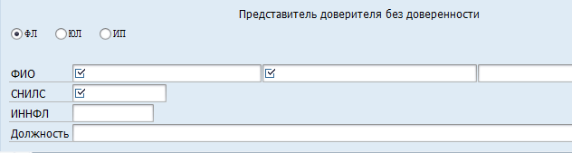 В зависимости от выбранной вкладки обязательные поля будут разные. Кроме того, для юрлица может быть выбран разный по типу представитель: физлицо, юрлицо или индивидуальный предприниматель.