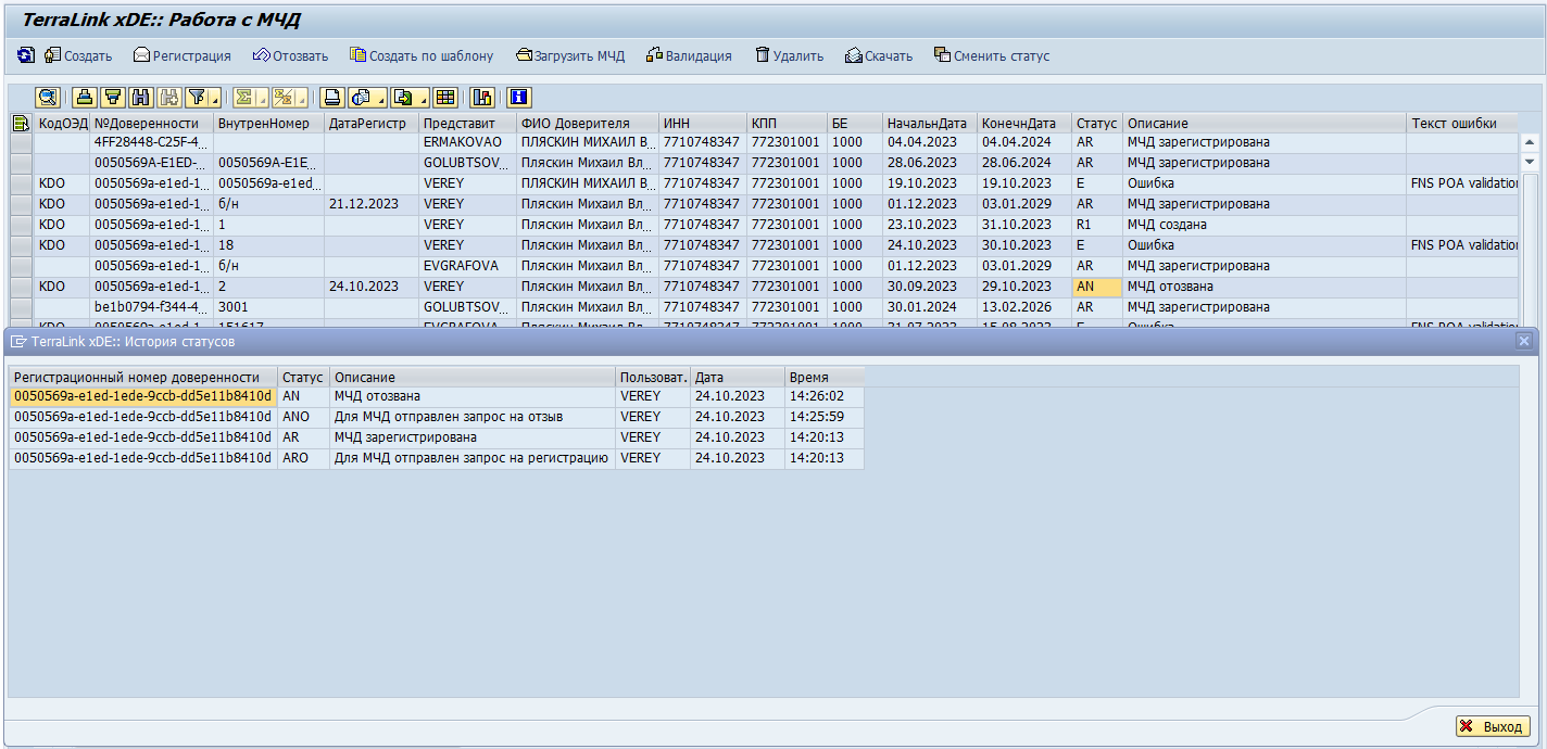 ALV-таблица содержит ограниченные данные, для детального просмотра отдельной МЧД нужно дважды кликнуть левой кнопкой мыши на ее регистрационном номере.