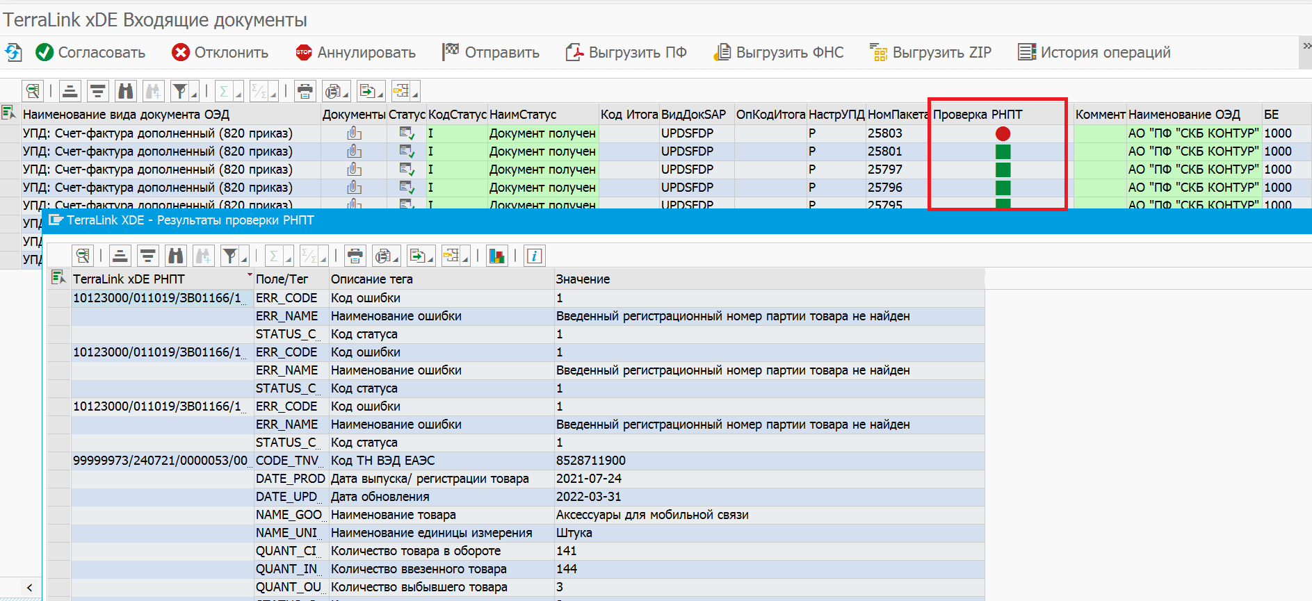 Модуль для проверки РНПТ позволяет в автоматическом режиме выполнять проверку кодов РНПТ (регистрационный номер партии товара), полученных из документов с прослеживаемостью. Проверка кодов РНПТ может осуществляться непосредственно из интерфейса учетной системы SAP ERP.