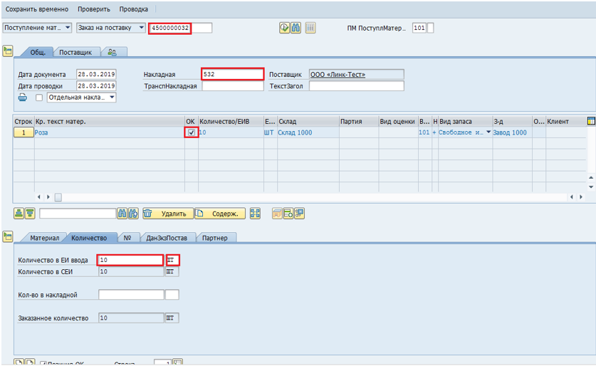 Проводка поступления материала (MIGO)¶