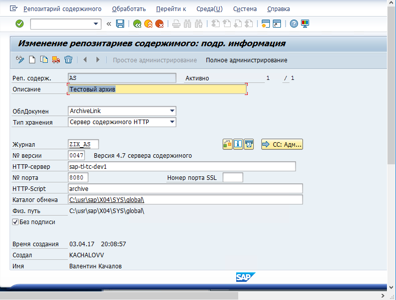 Кроме того, необходимо запустить транзакцию OAC0 и определить для соответствующего репозитория содержимого адрес HTTP-сервера, на котором
