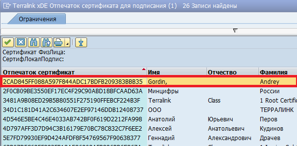 Ведение сертификатов пользователей в системе SAP осуществляется в настроечной таблице /TRL/XDE_V_CERT.