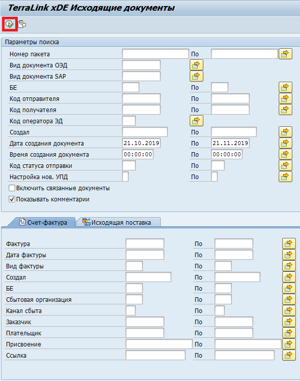 Для просмотра очереди исходящих документов запустите транзакцию /TRL/XDE_OUTBOX, введите на селекционном экране требуемые ограничения (например, по дате отправки) и нажмите кнопку