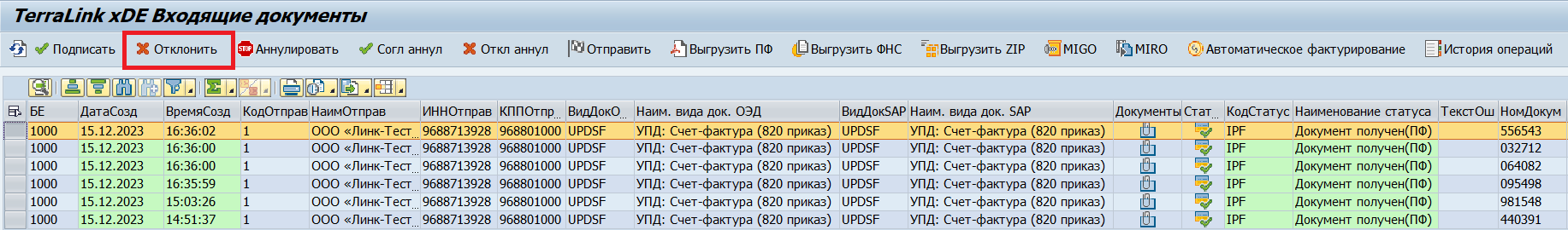 Для отклонения (отказа в подписании) входящего документа необходимо выделить требуемый документ на основном экране транзакции /TRL/XDE_INBOX