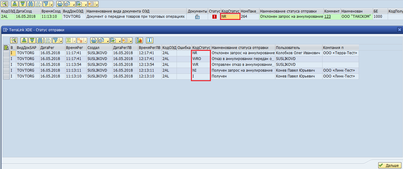 аннулирование, статус документа меняется на «Отправлен запрос на