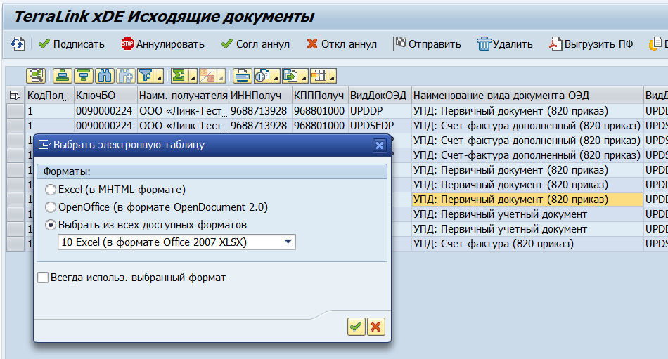 Для выгрузки в Excel данных по отправленным документам необходимо выполнить следующие действия.
