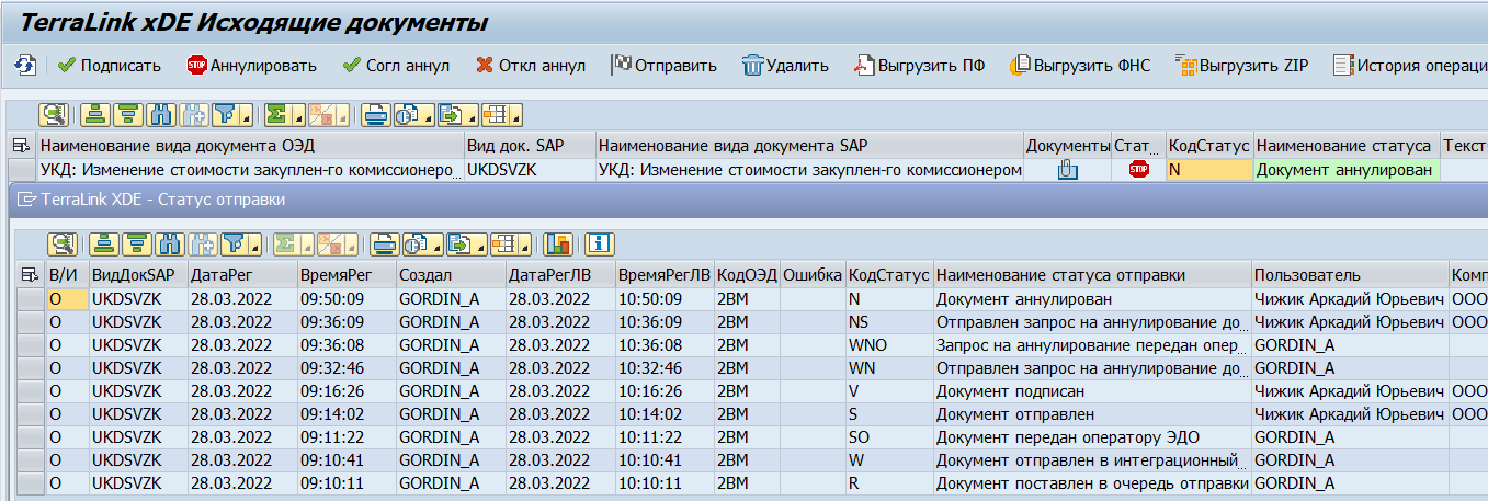 аннулирование, статус документа меняется на «Отправлен запрос на