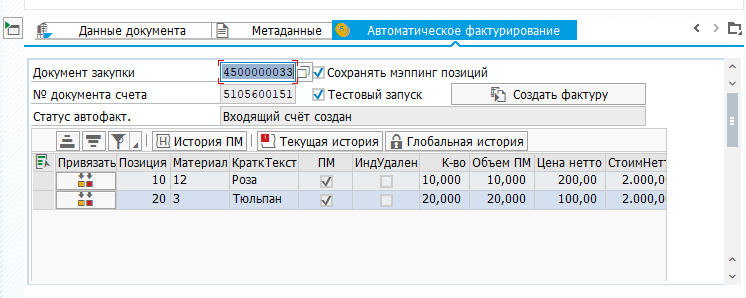 MIGO,MIRO. Кнопки отображаются, если подключен модуль для предзаполнения MIGO/MIRO.Автофактурирование — при нажатии на данную кнопку происходит автоматическое создание фактур в системе SAP. Кнопка отображается, если подключен модуль автоматического фактурирования.