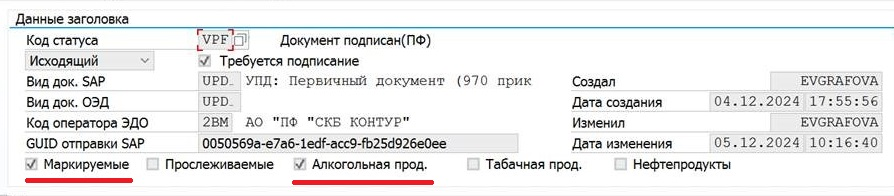 Для УПД в формате, утвержденном ФНС по приказу 970, а также для УПД в формате, утвержденном ФНС по приказу 970 с учетом изменений, вносимых в приказ 970 приказом 1032, в блоке «Данные заголовка» будет присутствовать перечень дополнительных признаков документа (маркировка, прослеживаемость, алкогольная продукция, табачная продукция и др.). В зависимости от наличия информации о том или ином виде продукции для документа будет отмечен соответствующий чекбокс.