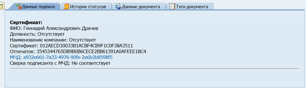 Данные подписи — закладка содержит информацию об ЭП отправителя и ЭП получателя (если документ требует двустороннего подписания), а также данные об МЧД (при ее использовании) и результат сверки подписанта документа и представителя, указанного в МЧД (работает при включенной настройке
