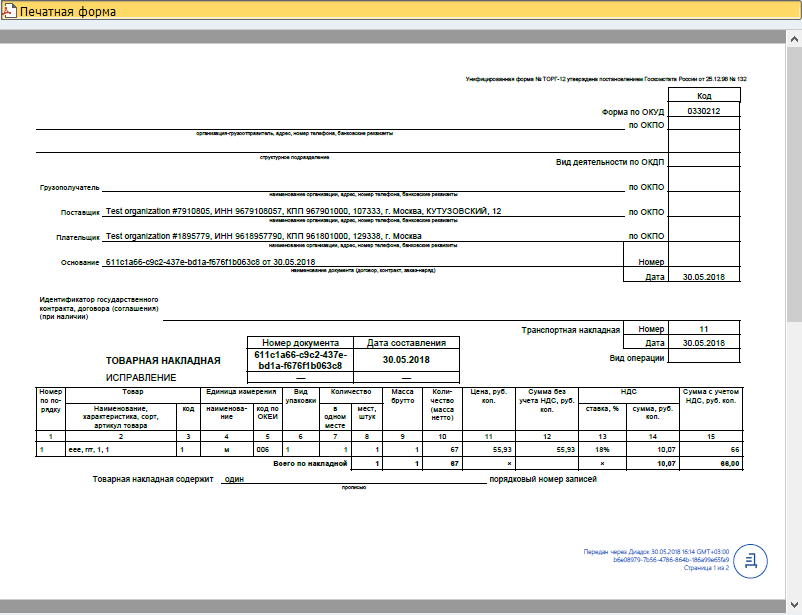 Печатная форма (просмотр PDF) — визуализирует печатную форму передаваемого документа.