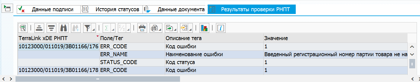Результаты проверки РНПТ — закладка отображается в карточке входящего документа в том случае, если подключен модуль проверки РНПТ, и содержит данные о результатах проверки кодов РНПТ для УПД и УКД, составленных на прослеживаемые товары.