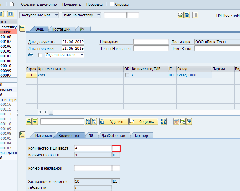 - «Количество в ЕИ ввода» в области подробных данных позиции