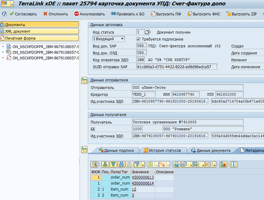 Код материала, переданный контрагентом в дополнительных данных к документу, должен совпадать с кодом материала в учетной системе SAP (см. раздел Сопоставление позиций электронного документа и документа SAP).
