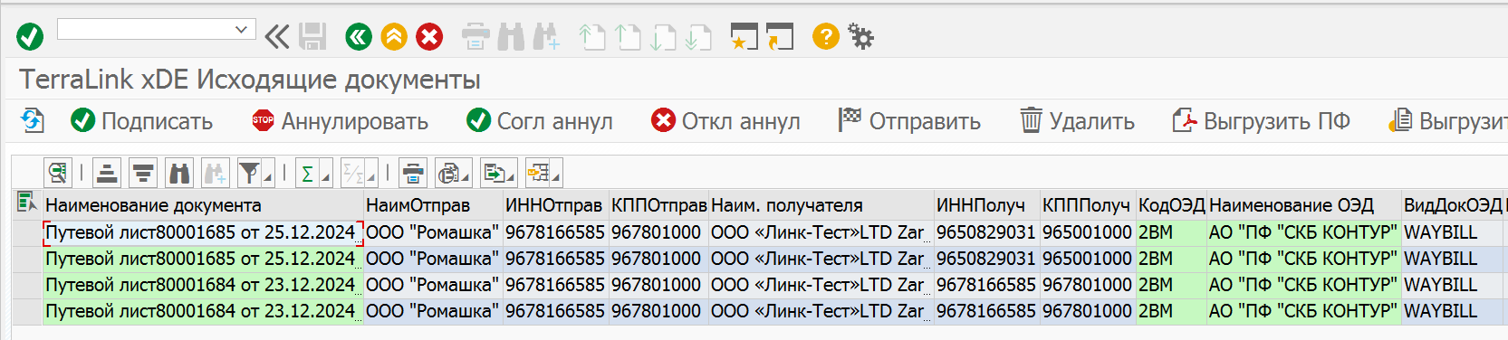 На основных экранах транзакций просмотра списков исходящих и входящих документов /TRL/XDE_OUTBOX и /TRL/XDE_INBOX для ЭПЛ отражается информация: