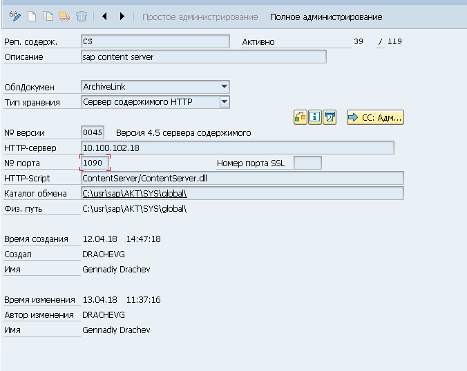 Кроме того, необходимо запустить транзакцию OAC0 и определить для соответствующего репозитория содержимого адрес HTTP-сервера, на котором