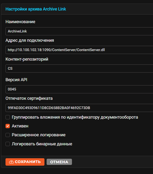 Подробное описание настройки нового типа архивного сервера см. Настройка архивирования документов.
