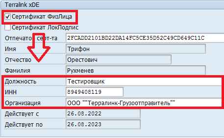 /TRL/XDE_V_CERTустановить флаг «Сертификат ФизЛица». При этом будут открыты на редактирование поля «Должность», «ИНН», «Организация».