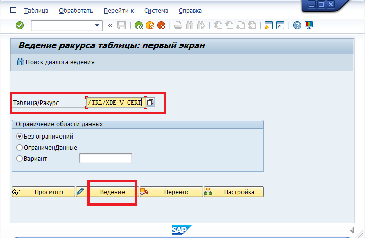 Ведение ракурса таблицы: первый экран. Введите имя таблицы/TRL/XDE_V_CERTи нажмитеВедение.