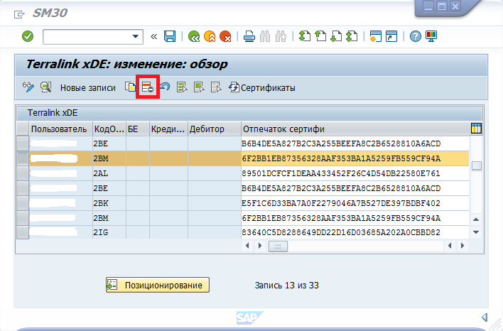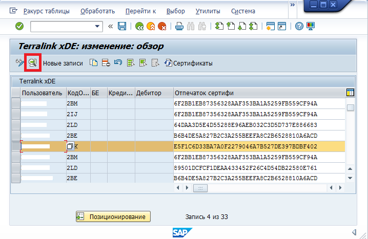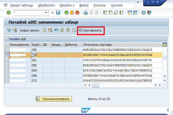 Ведение сертификатов пользователей в системе SAP осуществляется в настроечной таблице /TRL/XDE_V_CERT.