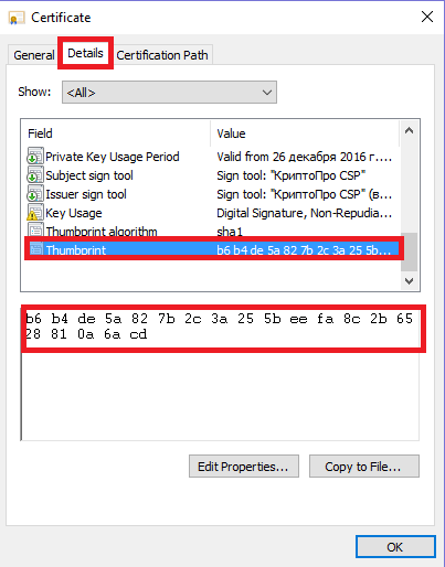 Details (Состав), выберите параметрThumbrint (Отпечаток)и скопируйте отобразившиеся в текстовом поле значение.
