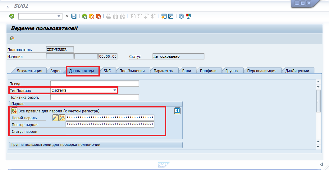 В системе SAP должен быть создан системный пользователь XDEWSUSER с постоянно действующим паролем. Для создания системного пользователя необходимо выполнить следующие действия.