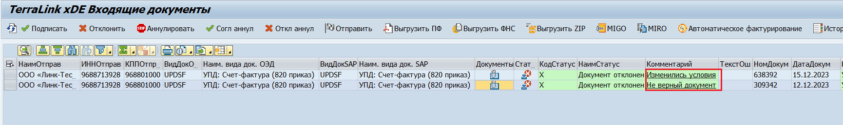 Для отклонения (отказа в подписании) входящего документа необходимо выделить требуемый документ на основном экране транзакции /TRL/XDE_INBOX