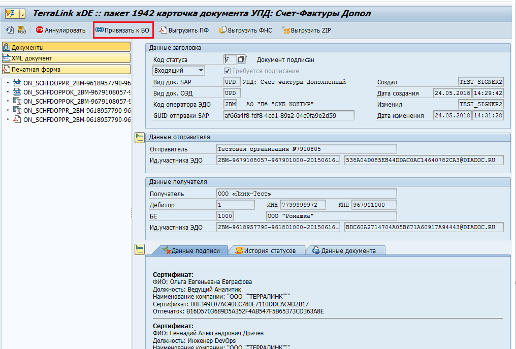 Для подписания входящего документа необходимо выделить требуемый документ на основном экране транзакции /TRL/XDE_INBOX и нажать кнопку