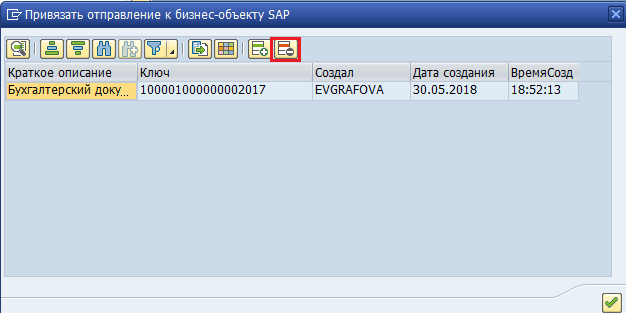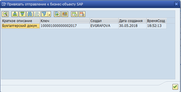 При нажатии кнопки «Привязать к БО» отобразится окно со списком уже привязанных к данной отправке финансовых документов SAP.