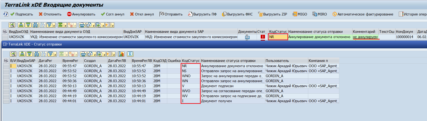 аннулирование, статус документа меняется на «Отправлен запрос на
