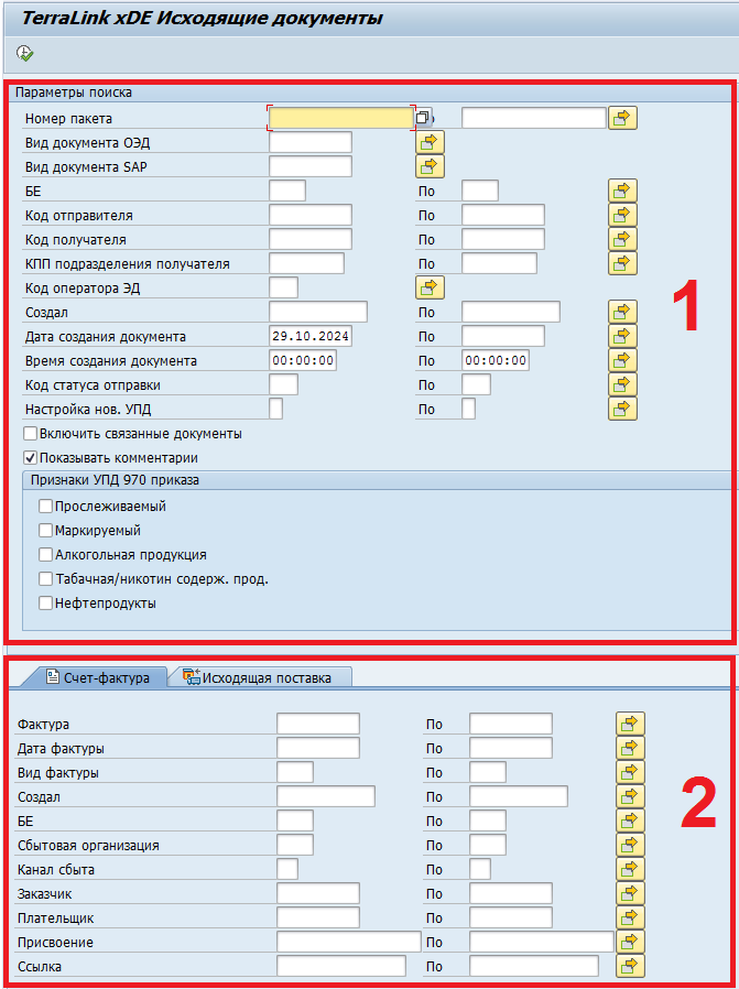 Закладки Счет-фактура, Исходящая поставка — содержат перечень критериев поиска по атрибутам БО SAP сбытового счета-фактуры и исходящей поставки, на основании которых была сделана отправка документов.